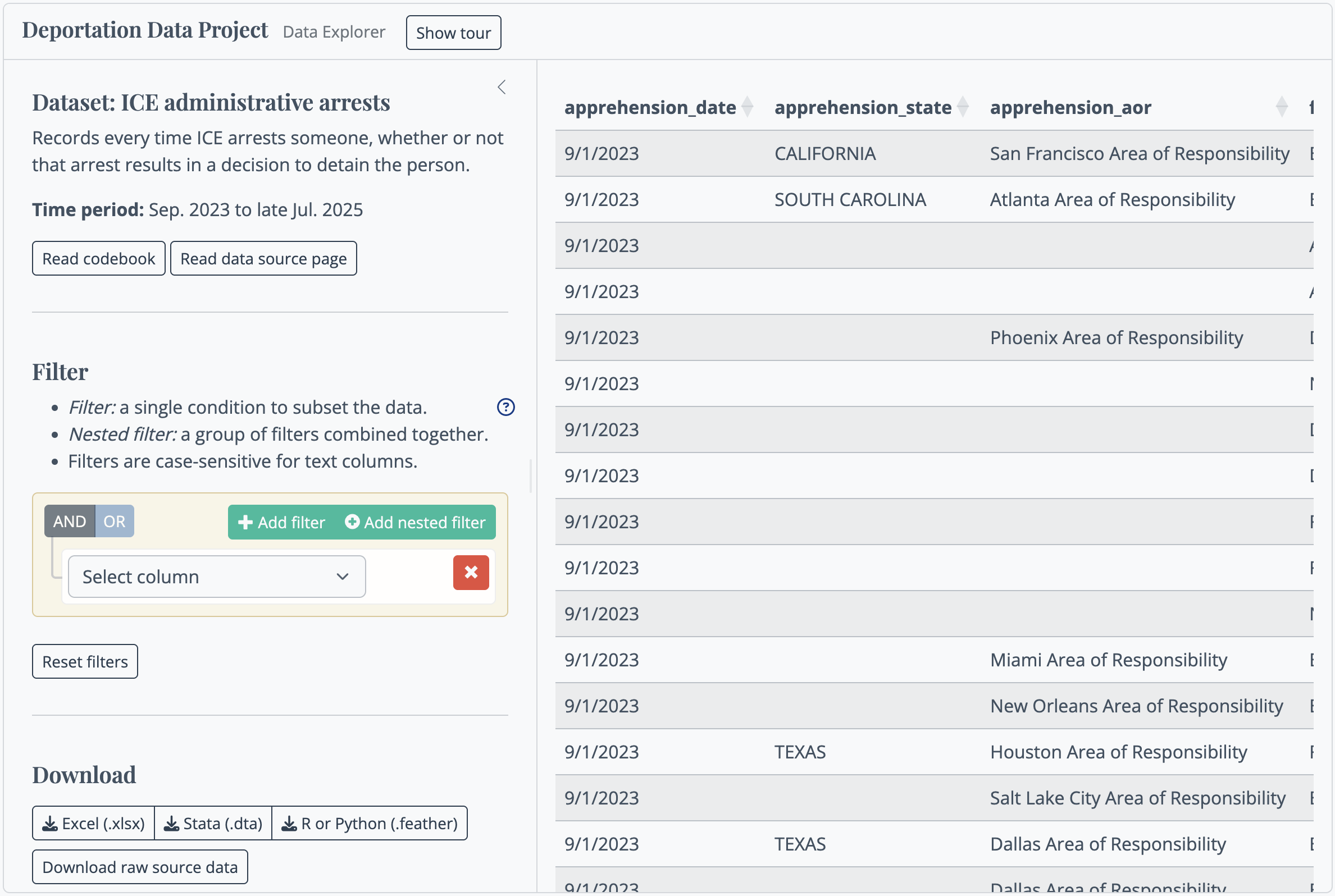 Our Explore tool allows users to interactively filter and view ICE immigration enforcement data, including arrests, detainer requests, detentions stays, and removals. Each dataset is available for download and further analysis.